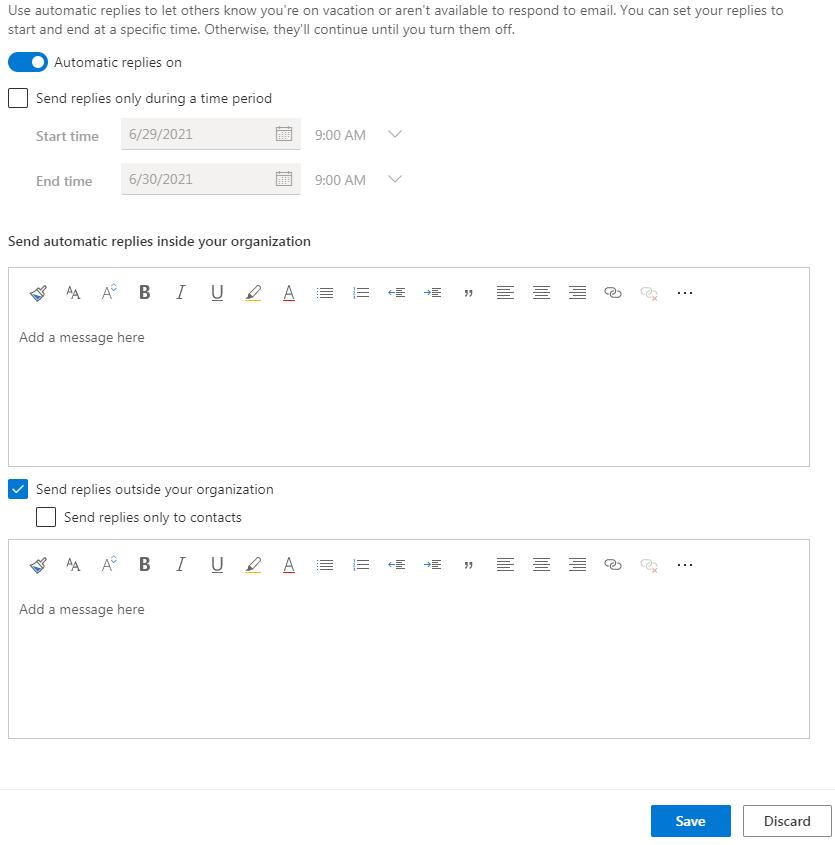 Use automatic replies to let others know you're on vacation or aren't available to respond to email. You can set your replies to start and end at a specific time. Otherwise, they';; continue until you turn them off.