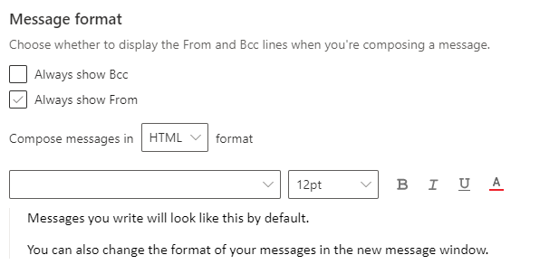 The Outlook Web App allows you to set the Bcc and From options to show in each new message
