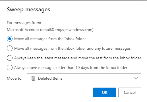 Note: The Sweep option isn't available from the following folders: Junk Email, Drafts, Sent Items, and Deleted Items. - Choose how you want to handle email messages from the sender you chose.
