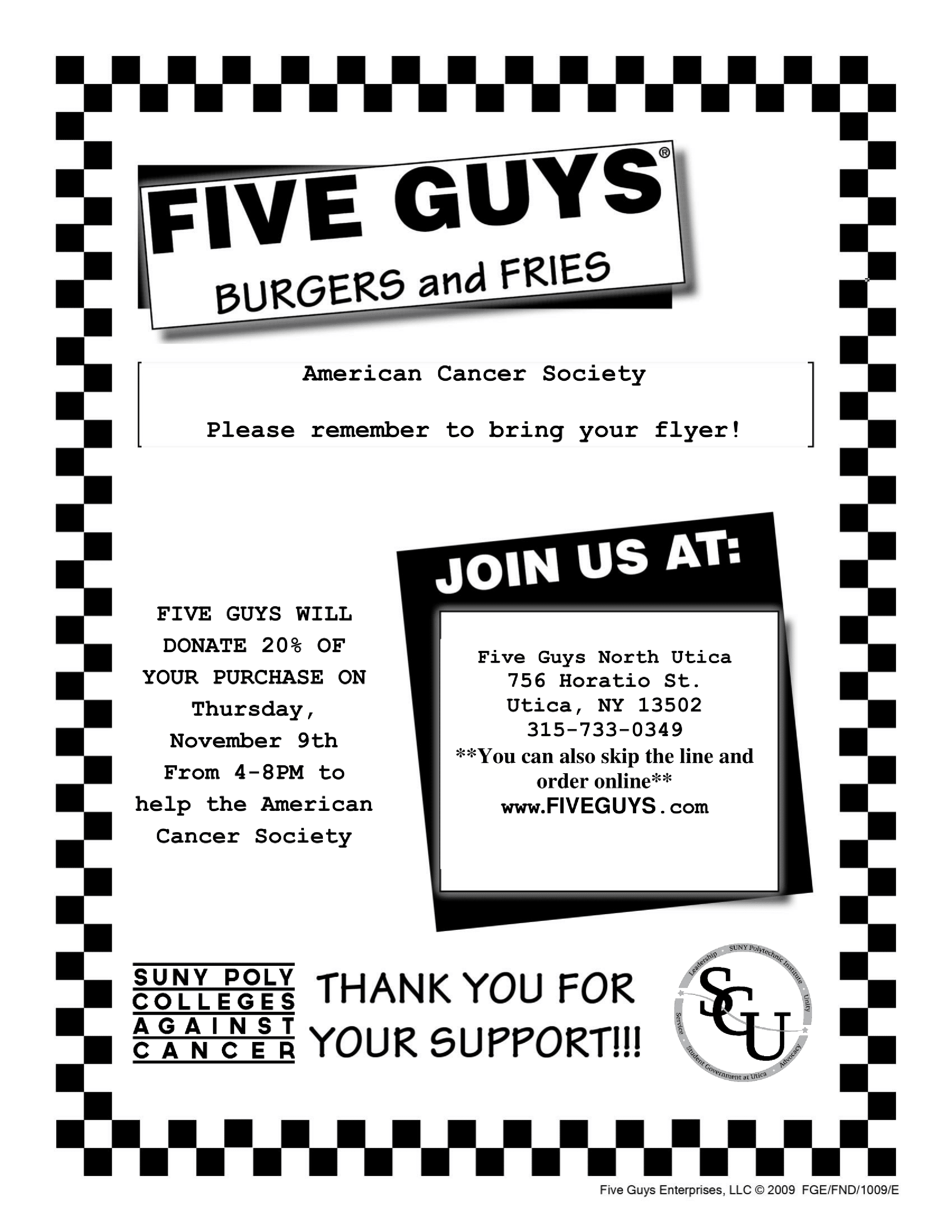 Colleges Against Cancer/Relay for Life will be holding a fundraiser at Five Guys on November 9 from 4-8 pm. Between those times, 20% of our order total will be donated back to our Relay for Life goal, NO FLYER REQUIRED. Located at the Five Guys in the same plaza as Walmart (by campus), 756 Horatio Street, Utica, NY 13502. Hope to see you there!